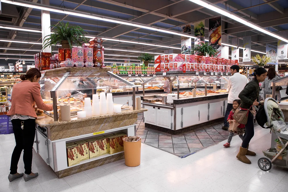 The banchan (Korean side dishes) are set up in a very inviting manner. Near the fresh produce and mini food court, a wide range of seasoned vegetables and marinated meats are divided into a couple stations. I like to refer to the longest station as the "Side Dish Palace." What a pleasure for the eye to observe!